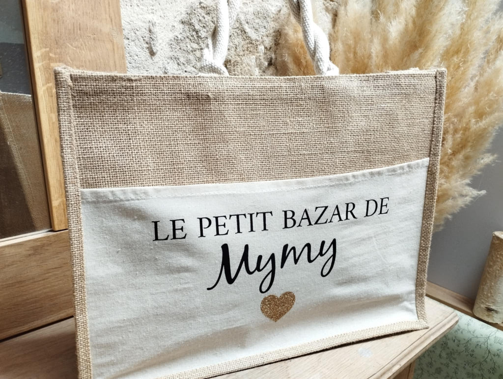 Cabas " Le petit bazar de ..." Cabas en toile de jute et coton personnalisable
