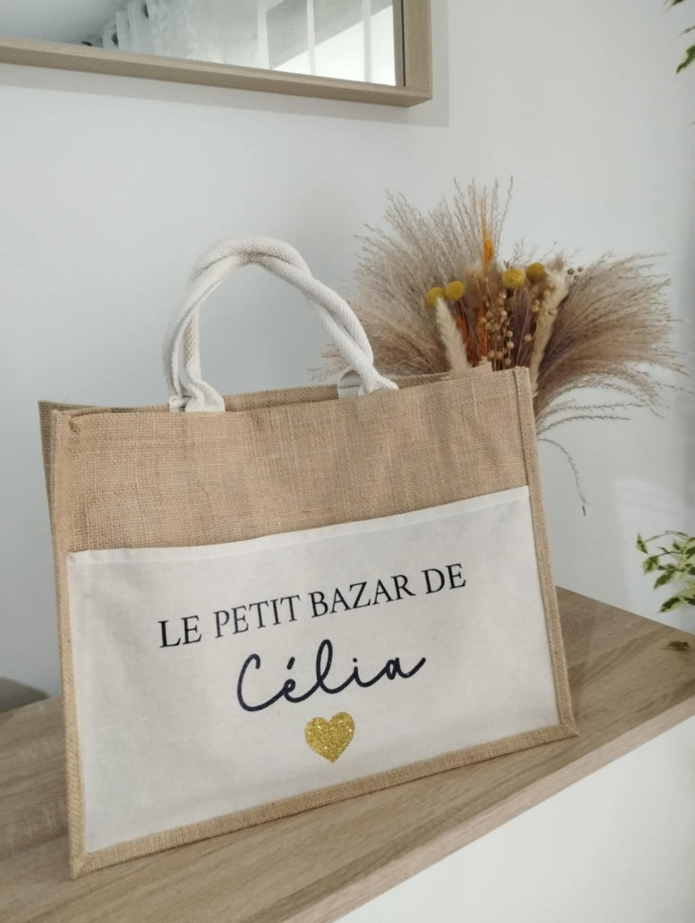 Cabas " Le petit bazar de ..." Cabas personnalisé en Toile de Jute. Ce sac doté d’une poche avant en toile 100% coton. Dimensions :...
